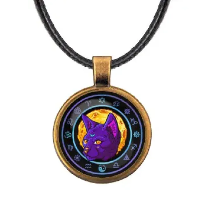 Кулон со шнурком «Лунный кот» из бижутерного сплава с покрытием под бронзу и стеклянной линзой.