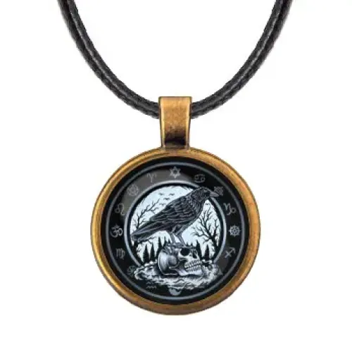 Кулон со шнурком. Изготовлен из бижутерного сплава с покрытием под бронзу и стекла. Дизайн включает изображение ворона на черепе под выпуклой стеклянной линзой.