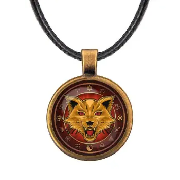 Кулон со шнурком из бижутерного сплава с изображением дикой кошки под выпуклой стеклянной линзой.