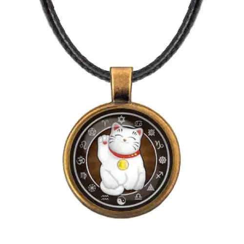 Сувенирный кулон Манеки-Неко из бижутерного сплава с изображением под стеклянной линзой.