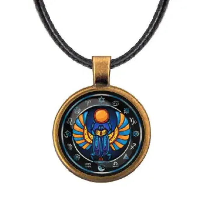Кулон со шнурком в виде крылатого скарабея. Изготовлен из бижутерного сплава с покрытием под бронзу, имеет стеклянную линзу.