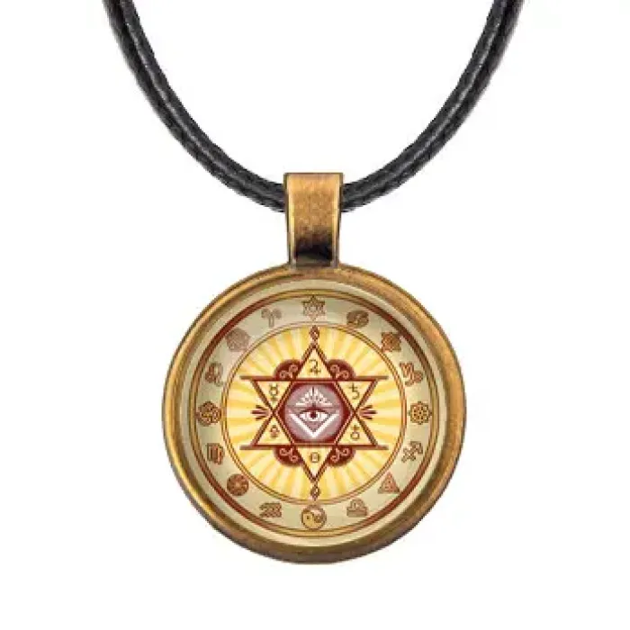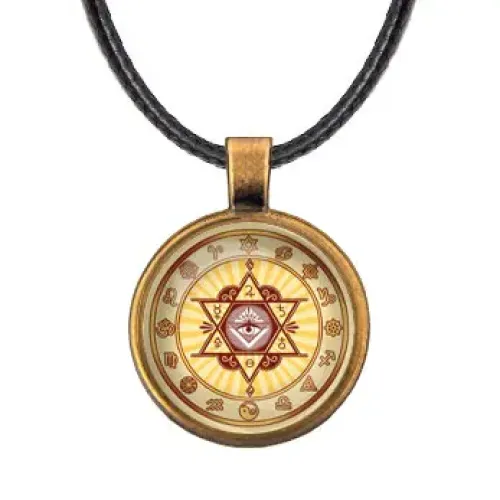 Кулон со шнурком в виде Звезды Давида из бижутерного сплава с покрытием под бронзу и стеклянной линзой.