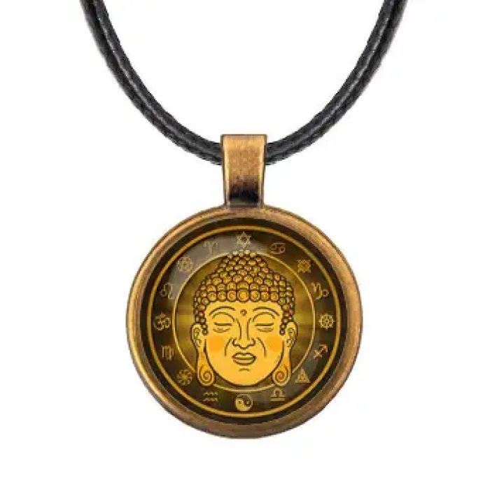 Кулон со шнурком из бижутерного сплава с изображением Будда под стеклянной линзой.