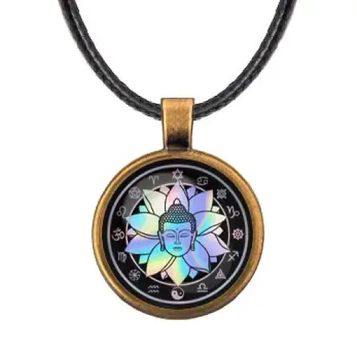 Кулон со шнурком с изображением Будды. Изготовлен из бижутерного сплава со стеклянной вставкой.