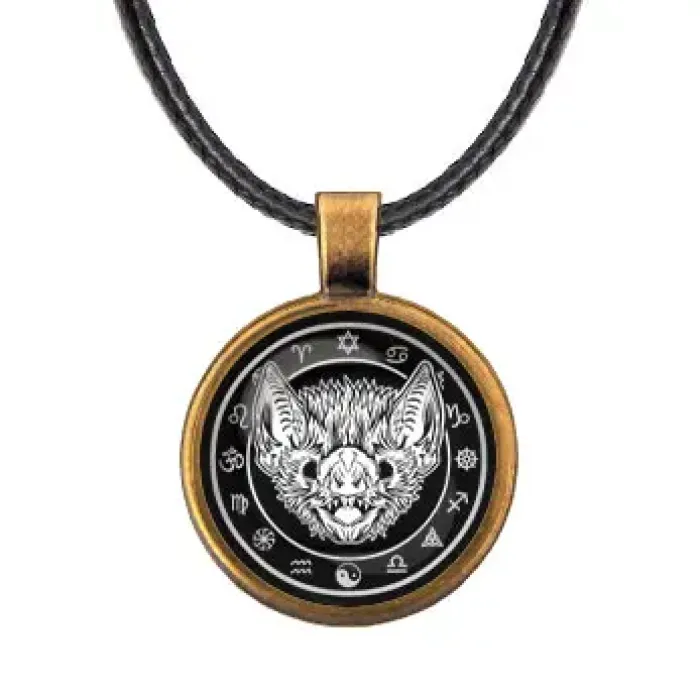 Кулон со шнурком в виде летучей мыши из бижутерного сплава с покрытием под бронзу и стеклянной линзой.
