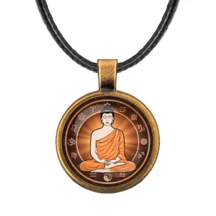 Кулон со шнурком с изображением Будды. Изготовлен из бижутерного сплава с покрытием под бронзу и стеклянной линзой.