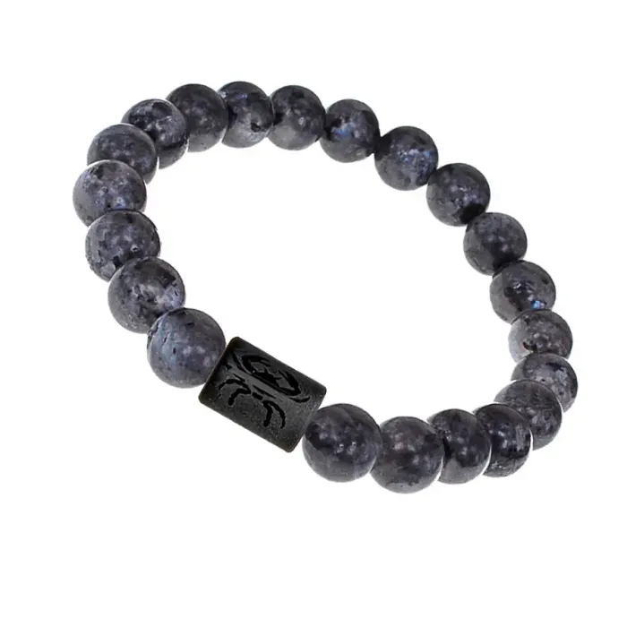 Стрейч-браслет с зодиакальной бусиной в виде знака Рак из синтетического шунгита и бусинами из натурального камня лабрадор.
