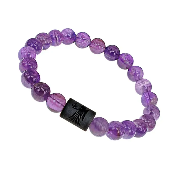 Стрейч-браслет с зодиакальной бусиной Дева из синтетического шунгита и бусинами из натурального аметиста.