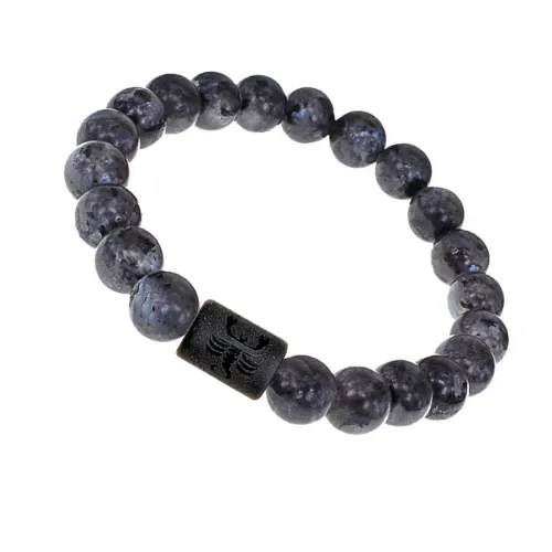 Стрейч-браслет с зодиакальной бусиной Скорпион из синтетического шунгита и бусин из натурального камня лабрадор.