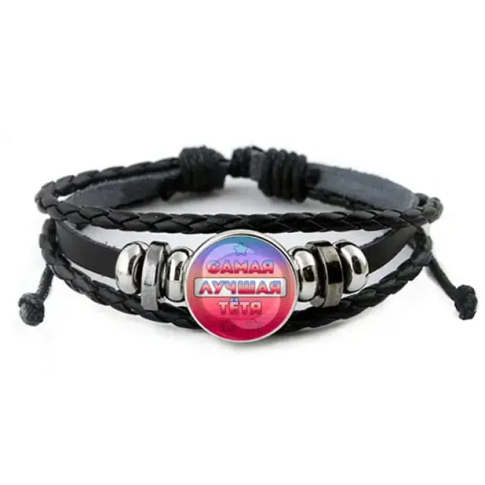 Кожаный браслет с символическим изображением, который станет прекрасным подарком для любимой тёти. Этот аксессуар выполнен из синтетической кожи и металла, а также оснащён выпуклой стеклянной линзой диаметром 20 мм, что придаёт ему особую привлекательность.