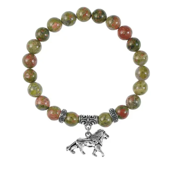 Браслет из натурального камня унакит с подвеской в виде льва из бижутерного сплава.