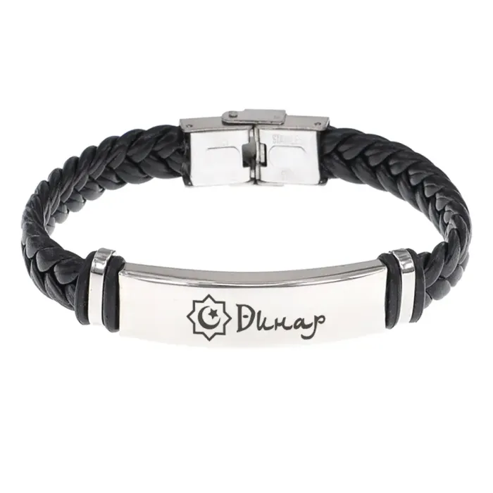 Мусульманский именной браслет из кожи с гравировкой и стальной фурнитурой.