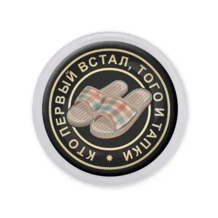 Акриловый магнит d.56мм Кто первый встал, того и тапки MAF0116