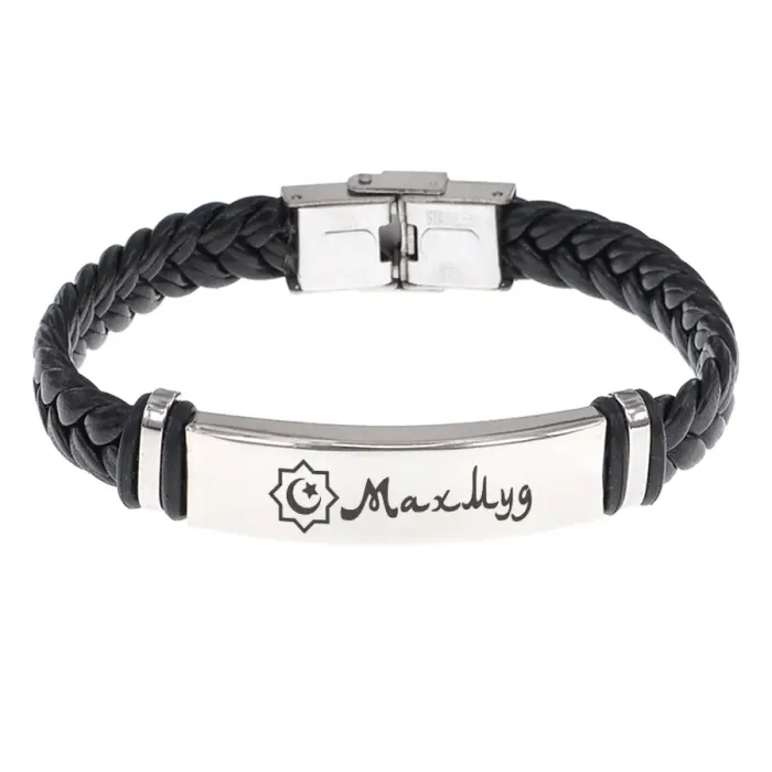 Мусульманский именной браслет. Плетёный кожаный браслет с гравировкой.
