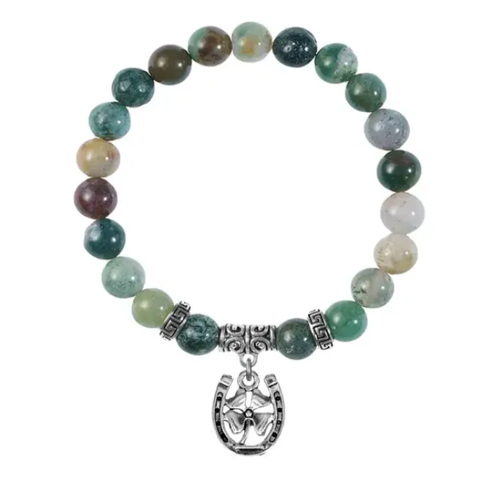 Браслет-амулет из натуральной яшмы с подвеской в виде подковы и клевера.