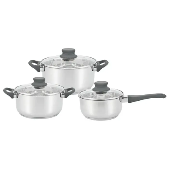 Посуда изготовлена из нержавеющей стали, что обеспечивает коррозионную стойкость и долговечность. Набор включает ковш и две кастрюли разного объёма для выполнения различных кухонных задач. Стеклянная крышка позволяет визуально контролировать процесс приготовления без потери тепла.