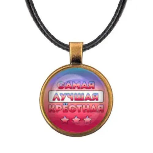 Кулон со шнурком «Самая лучшая крёстная» — это стильный и символичный аксессуар, который станет прекрасным подарком для крестной. Изготовленный из бижутерного сплава с покрытием под бронзу и стекла, он сочетает в себе элегантность и прочность. Диаметр кулона составляет 28 мм, а изображение защищено выпуклой стеклянной линзой, что придаёт ему особую выразительность.