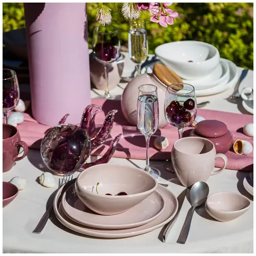 Тарелки выполнены из упрочненного фарфора, что обеспечивает повышенную прочность. Поверхность изделий устойчива к воздействию высоких температур и механическим воздействиям. Коллекция представлена в нескольких цветовых решениях, включая брусничный, пудровый и белый.