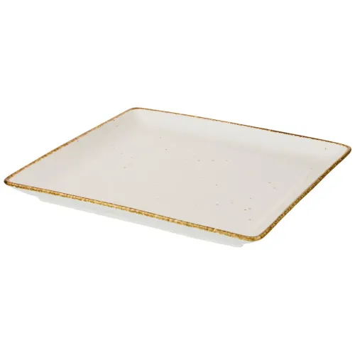 Тарелка изготовлена из упрочненного фарфора, покрытого глазурью для повышения долговечности. Квадратная форма и ровные края являются элементами дизайна. Устойчивость к высоким температурам обеспечивается свойствами материала и технологией производства.