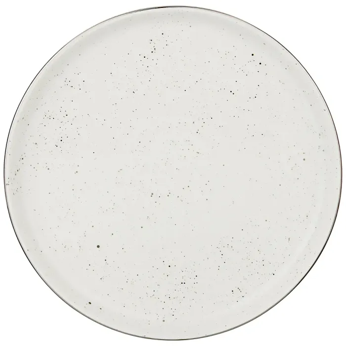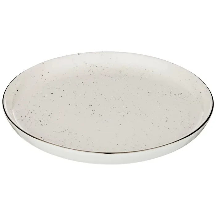 Тарелка выполнена из упрочненного фарфора, что повышает её прочность и долговечность при ежедневном использовании. Прямые формы изделия создают современный внешний вид. Декоративное оформление включает тонкую платиновую окантовочную полосу и мелкие платиновые брызги.