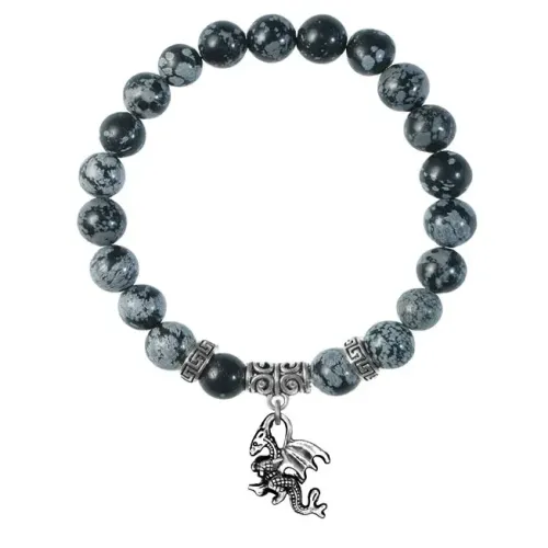 Браслет-амулет из натурального снежного обсидиана с подвеской в виде дракона из бижутерного сплава.