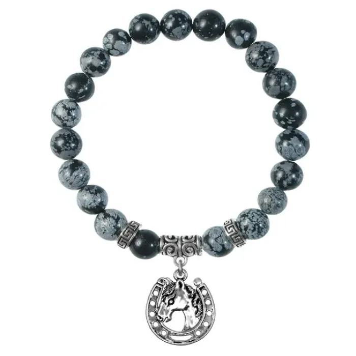 Браслет-амулет из натурального снежного обсидиана с подвеской в виде подковы из бижутерного сплава.