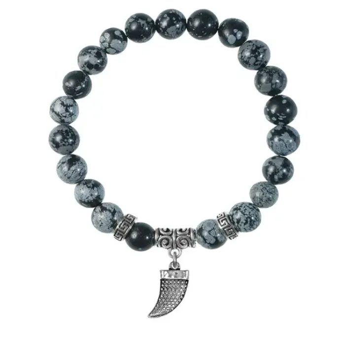 Браслет-амулет из натурального снежного обсидиана с подвеской в виде клыка.