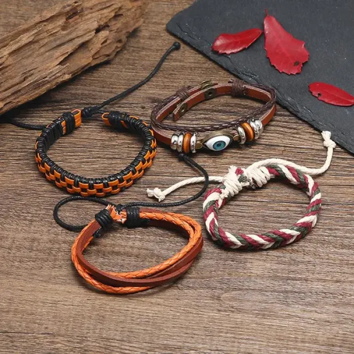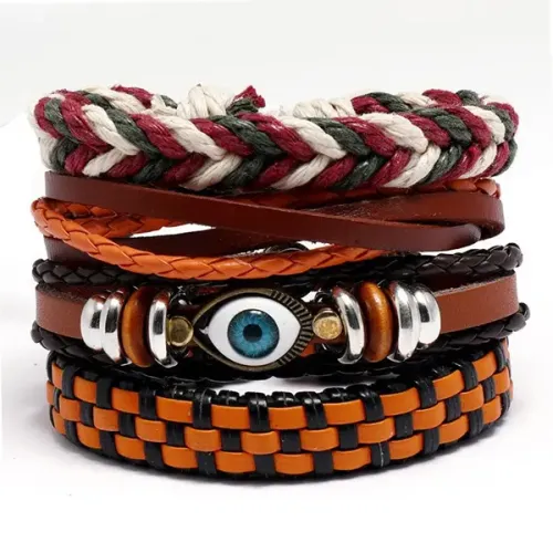 Набор из четырёх браслетов для защиты от сглаза. Материалы: натуральная кожа, дерево, металл, пластик и стекло.