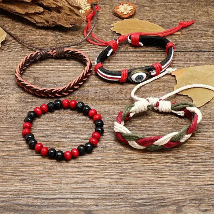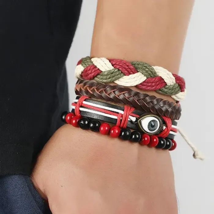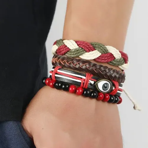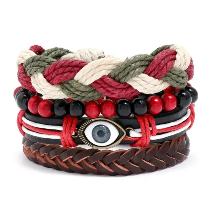 Набор из четырёх браслетов от сглаза, изготовленных из кожи, дерева, металла, пластика и стекла. Браслеты регулируются по размеру.