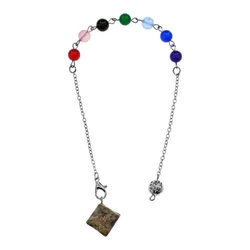 Маятник для практик из бижутерного сплава и натурального унакита с символикой семи чакр и Меркабы.