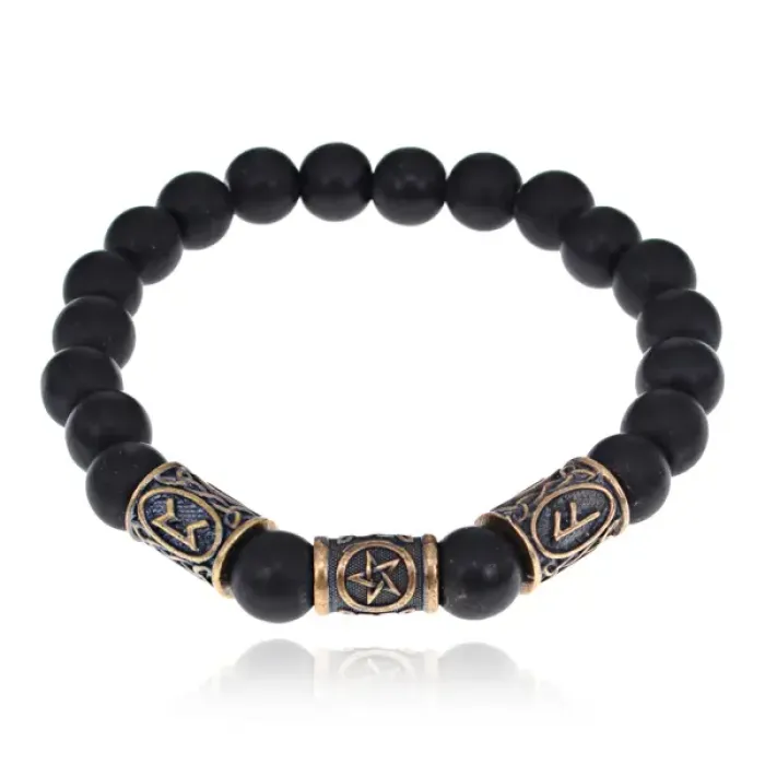 Рунический стрейч-браслет из синтетического камня с символами пентаграммы и рун.