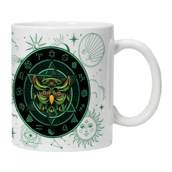 Кружка изготовлена из керамики, что обеспечивает термостойкость и гигиеничность. На поверхность нанесено декоративное изображение совы. Конструкция включает удобную ручку для комфортного использования.