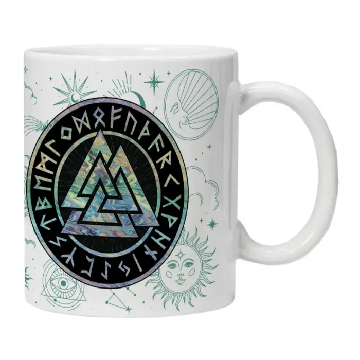 Кружка имеет классическую цилиндрическую форму с ручкой. На внешнюю поверхность нанесено декоративное изображение.