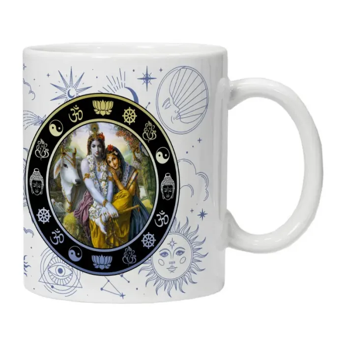 Кружка предназначена для подачи горячих и холодных напитков. Изделие украшено изображением Кришны и Радхи, нанесённым на внешнюю поверхность.