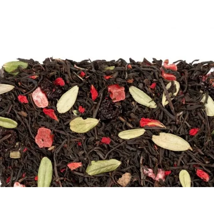 Крупнолистовой чёрный чай с ярким ягодным характером, созданный на основе классической базы с добавлением кусочков фруктов, листьев брусники и цветков граната. Насыщенный настой раскрывается нотами спелой черешни, оттенками лесных ягод и лёгкими цветочными акцентами.