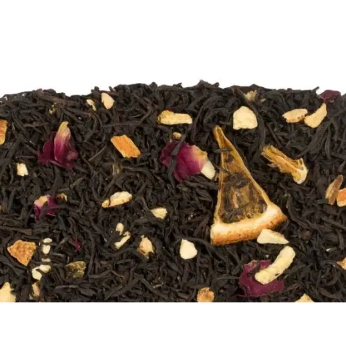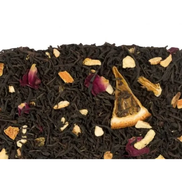 Состав: Чай чёрный рассыпной листовой крупный, цедра апельсина, сегменты апельсина, лепестки красной розы, ароматизаторы.