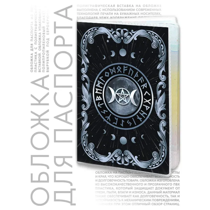 Обложка для паспорта из прозрачного ПВХ-пластика с полиграфической вставкой, украшенная викканским амулетом Знаком Богини. Этот символ традиционно используется для защиты от зла и тёмных сил, что делает обложку не только практичным аксессуаром, но и оберегом в повседневной жизни и во время ритуалов. Обе стороны обложки имеют одинаковое изображение, а упаковка выполнена в удобном полипропиленовом пакете с вырубкой под еврокрючок.