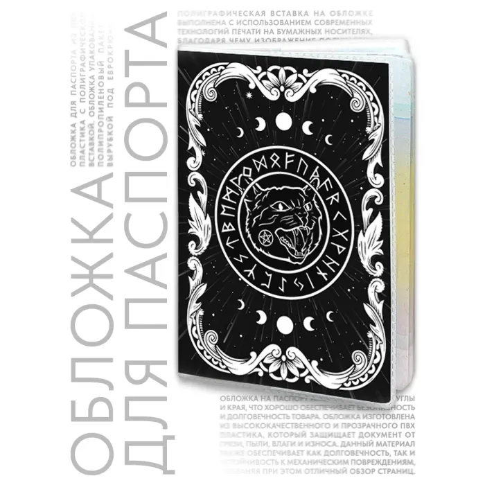 Обложка для паспорта из прозрачного ПВХ-пластика с полиграфической вставкой, украшенная изображением чёрного кота. Этот амулет традиционно считается символом удачи и защиты от злых сил. Обе стороны обложки имеют одинаковый дизайн, что придаёт ей стильный вид. Упакована в удобный полипропиленовый пакет с вырубкой под еврокрючок, что делает её идеальным вариантом для подарка или личного использования. Обложка не только защищает паспорт, но и служит модным аксессуаром, который подчеркнёт индивидуальность.