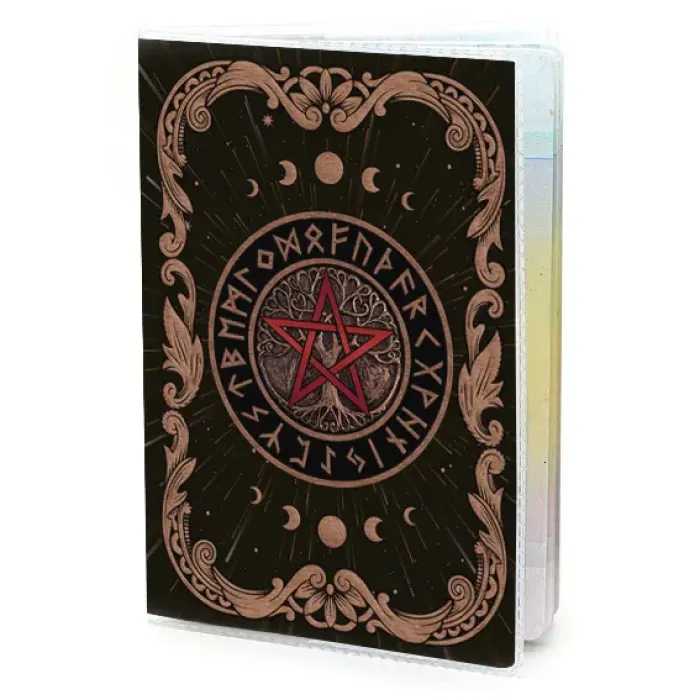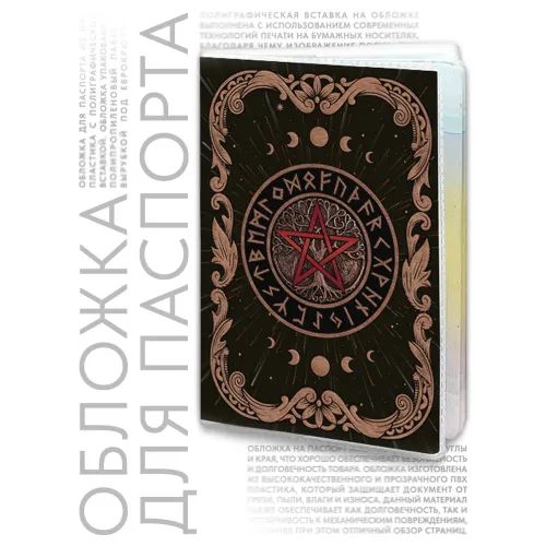 Обложка для паспорта из прозрачного ПВХ-пластика с полиграфической вставкой, украшенная изображением двух мощных защитных символов — Пентаграммы и Дерева жизни. Эти символы традиционно ценятся за свою силу в защите от негативных воздействий и неблагоприятных событий. Обложка упакована в удобный полипропиленовый пакет с вырубкой под еврокрючок, что делает её идеальным вариантом как для личного использования, так и в качестве подарка. Оба изображения на обложке одинаковые, что придаёт ей стильный вид.