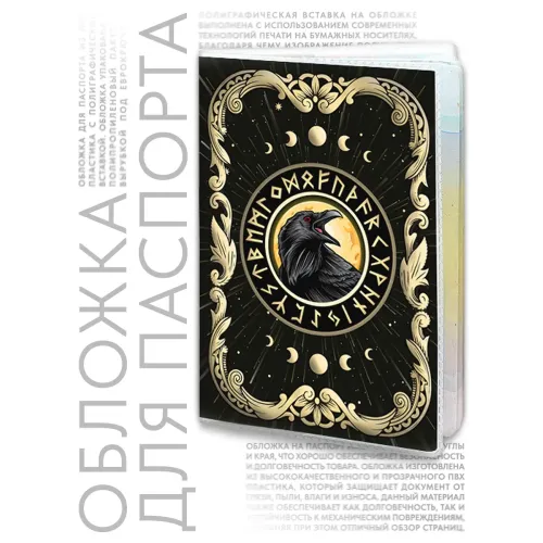 Обложка для паспорта из прозрачного ПВХ-пластика с полиграфической вставкой, украшенная изображением Чёрного ворона — символа мудрости и удачи. Обе стороны обложки имеют одинаковый дизайн, что придаёт ей стильный вид. Упакована в удобный полипропиленовый пакет с вырубкой под еврокрючок, что делает её идеальным вариантом как для личного использования, так и в качестве подарка. Рунический амулет Чёрный ворон традиционно ценится за способность приносить удачу и тайные знания своему обладателю.