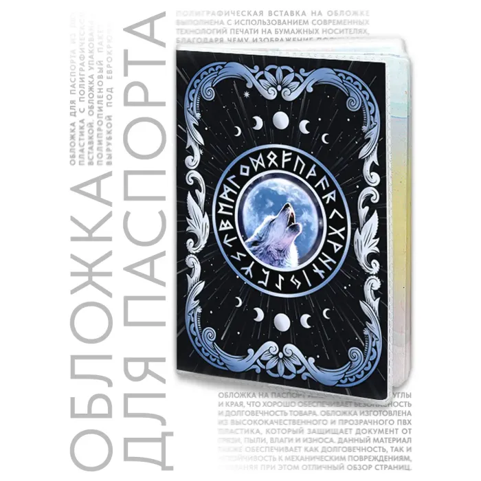Обложка для паспорта из прозрачного ПВХ-пластика с двусторонней полиграфической вставкой с изображением волка.
