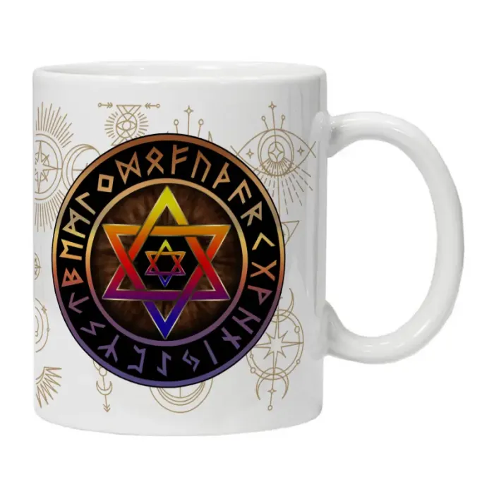 Кружка предназначена для подачи горячих и холодных напитков. Изделие украшено изображением, связанным с символикой амулета «Звезда Давида».