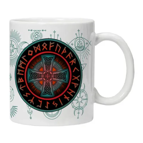 Рекомендуется ручная мойка для сохранения декоративного покрытия. Кружка с изображением кельтского креста может использоваться как тематический аксессуар.