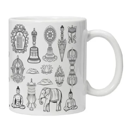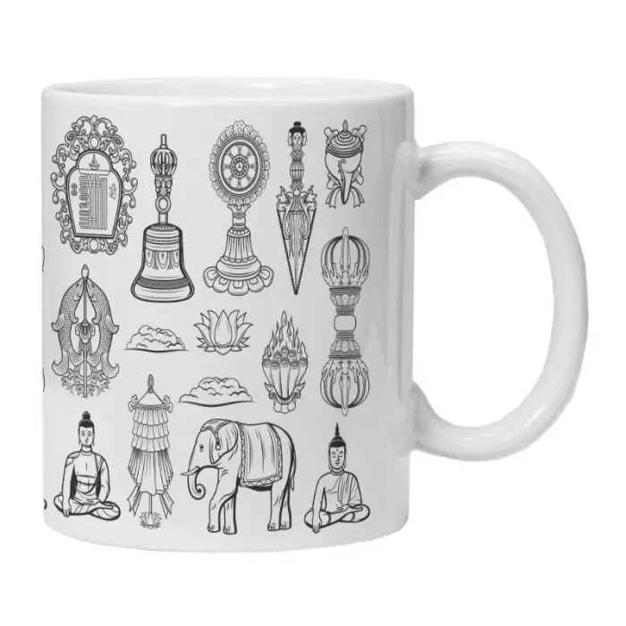 Кружка имеет классическую цилиндрическую форму. Основным декоративным элементом является нанесённое изображение на тему буддизма.