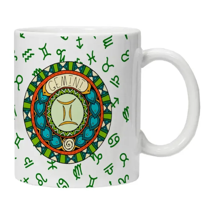 Кружка изготовлена из керамики — материала, устойчивого к высоким температурам и обеспечивающего сохранение температуры напитка. На внешнюю поверхность нанесено декоративное изображение по теме «Близнецы».