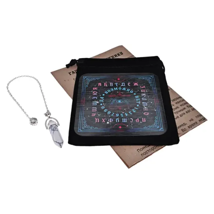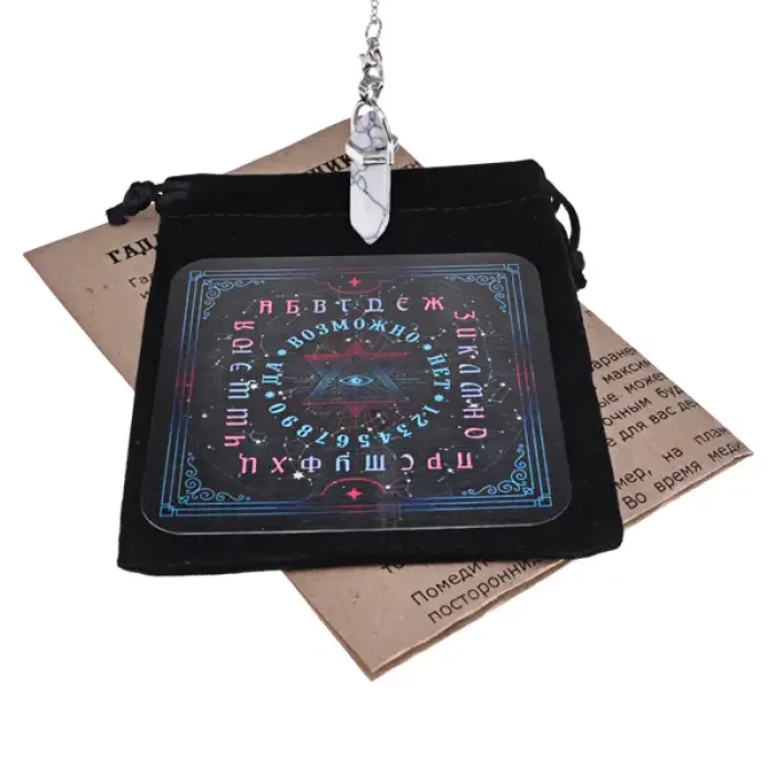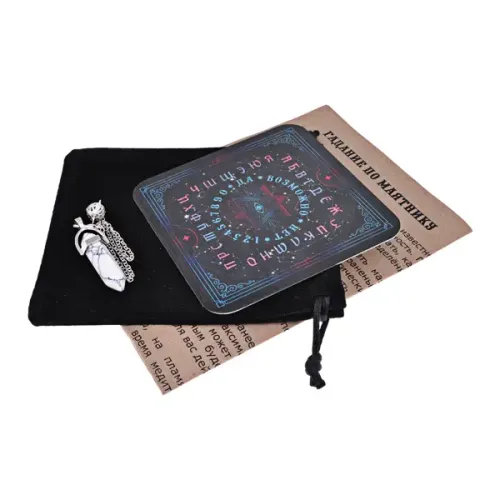 Размеры и комплектация: В набор входят маятник, табличка для гадания, бархатный мешочек и инструкция. Упаковка — полипропилен с европодвесом.