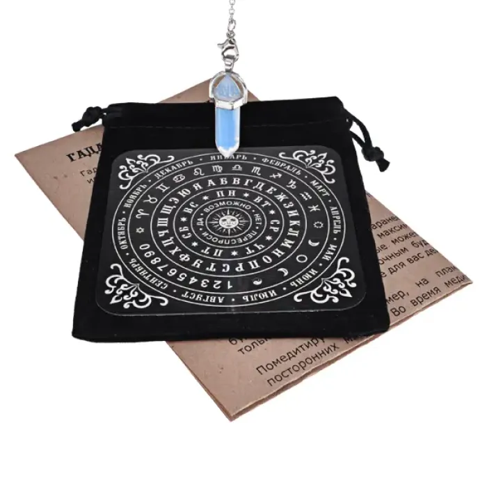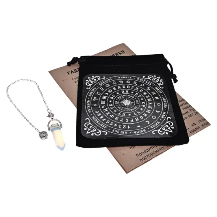 Набор для гадания с маятником Лунный камень — это уникальный инструмент, который позволяет исследовать тайны и загадки внутреннего мира. Состав набора включает биолокационный маятник из синтетического лунного камня, известного своей способностью помогать в поиске ответов на важные вопросы. В комплект также входит цепочка, табличка для гадания, бархатный мешочек для удобного хранения и инструкция по использованию. Упаковка выполнена в виде полипропиленового пакета с европодвесом, что делает набор идеальным подарком или сувениром. Этот набор традиционно используется как средство самопознания и духовной практики.
