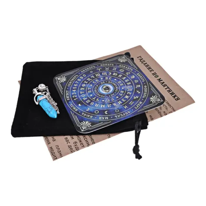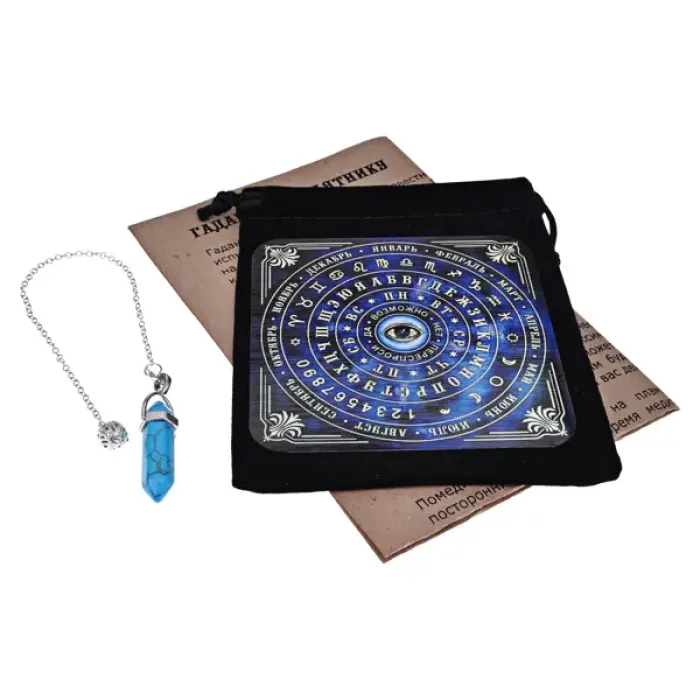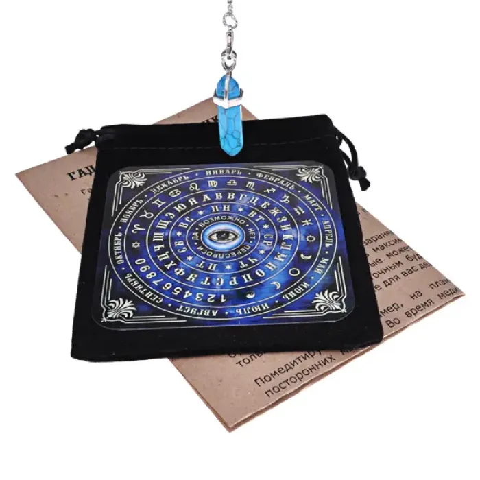 Набор для гадания с маятником из синтетической бирюзы, включает табличку для интерпретации.