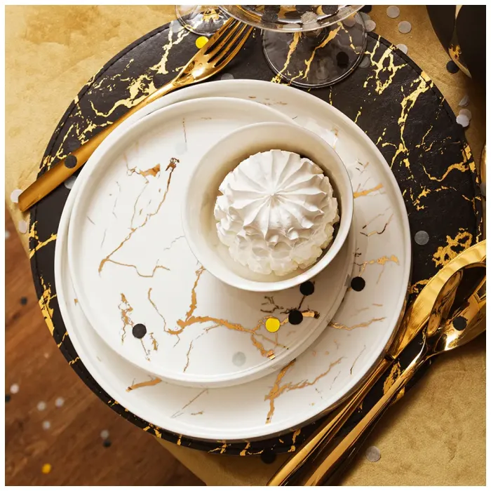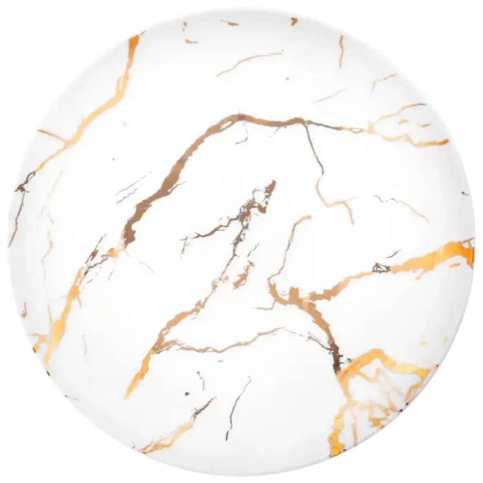 Тарелки выполнены из упрочненного фарфора, что повышает их прочность и устойчивость к механическим воздействиям. Поверхность изделий имеет глянцевое покрытие. Дизайн характеризуется четкими линиями и утонченной формой.