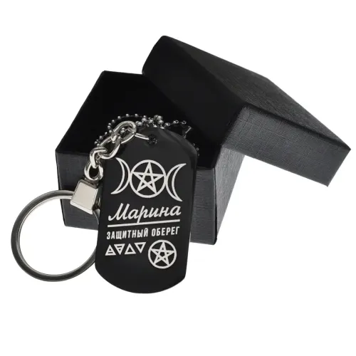 Размеры и комплектация: Размер жетона 49х28 мм. В комплекте кольцо для ключей, шариковая цепочка с регулировкой длины и подарочная коробка.